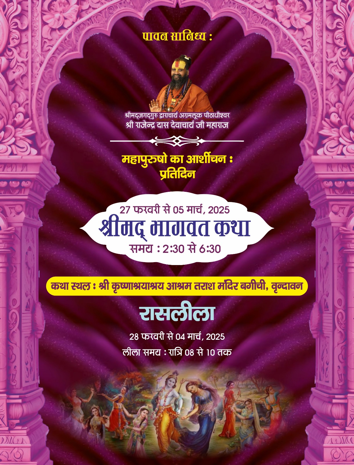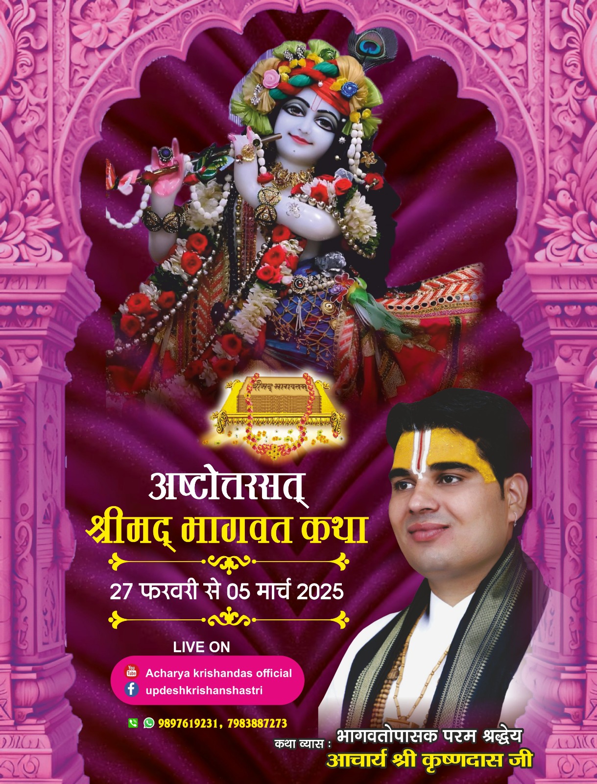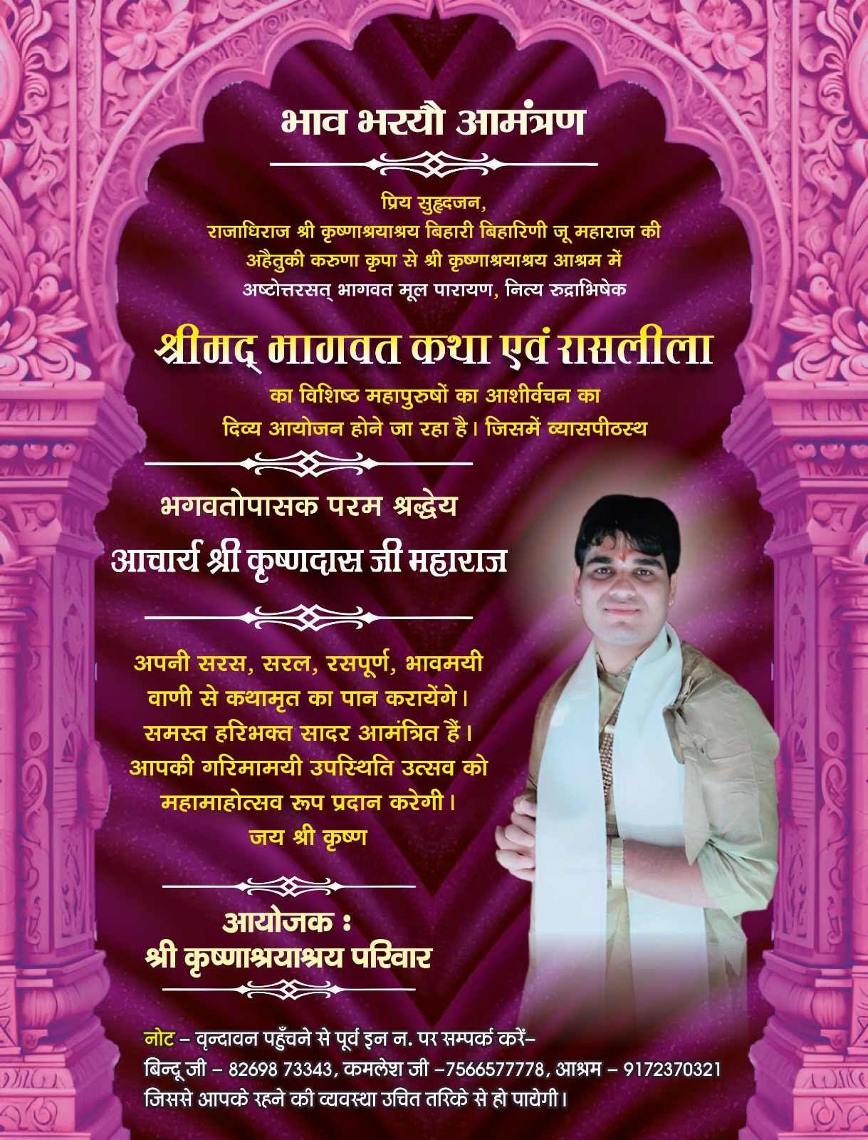 Acharya Shri Krishna Das Ji Maharaj is a well-known speaker of stories from the Shrimad Bhagwat, Ram Katha, Shiv Puran, and other sacred texts. He resides in Shri Krishna Shrayashray Ashram in Vrindavan and has been sharing the teachings of the Shrimad Bhagwat for the past nineteen years. His spiritual discourses have reached almost every region of India, including Nagpur, Maharashtra, Punjab, Mumbai, Gujarat, Delhi, Ahmedabad, Gwalior, Kolkata, Guwahati, Bengaluru, Jharkhand, and more.