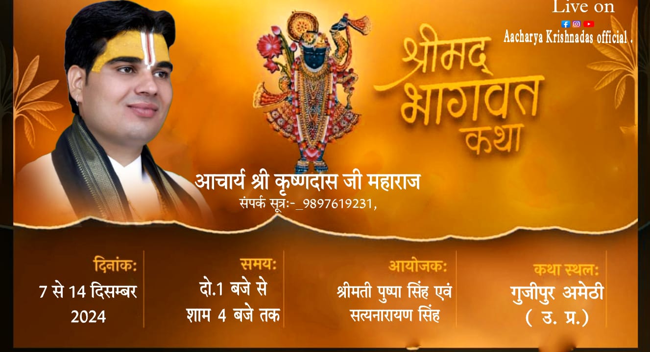 Acharya Shri Krishna Das Ji Maharaj is a well-known speaker of stories from the Shrimad Bhagwat, Ram Katha, Shiv Puran, and other sacred texts. He resides in Shri Krishna Shrayashray Ashram in Vrindavan and has been sharing the teachings of the Shrimad Bhagwat for the past nineteen years. His spiritual discourses have reached almost every region of India, including Nagpur, Maharashtra, Punjab, Mumbai, Gujarat, Delhi, Ahmedabad, Gwalior, Kolkata, Guwahati, Bengaluru, Jharkhand, and more.